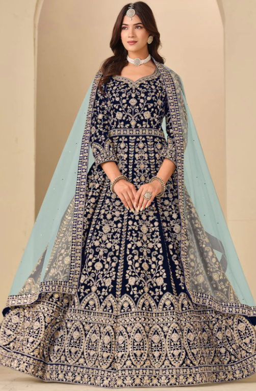Regular price £214.86 GBPRegular priceUnit price / per£244.27 GBPSale price £214.86 GBP-12% OFFBlue Plus Size Bridal Sangeet Wedding Party Gown In Velvet SFDFS38203