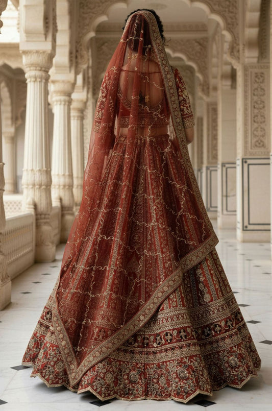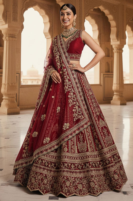 Regular price £444.83 GBPRegular priceUnit price / per£477.10 GBPSale price £444.83 GBP-6% OFFRed Silk Bridal Lehenga Choli Set SFANJ3174