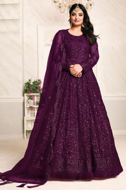 Regular price From £125.17 GBPRegular priceUnit price / per£155.15 GBPSale price From £125.17 GBP-19% OFFPurple Bridal Plus Size Anarkali Suit In Net SFDFS11702