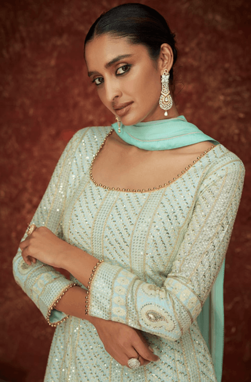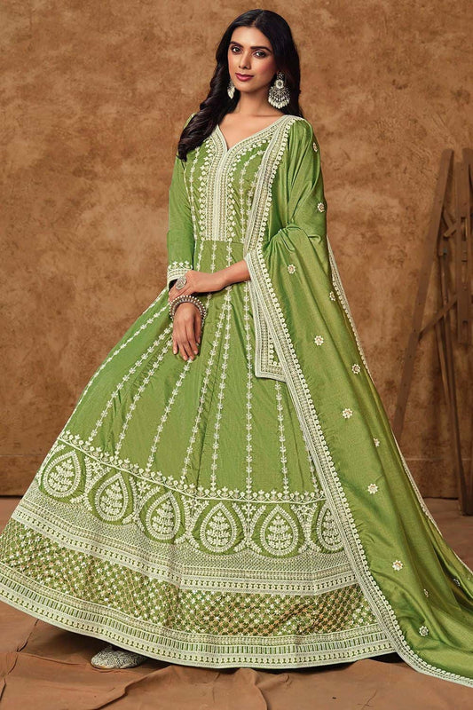 Regular price £148.45 GBPRegular priceUnit price / per£163.67 GBPSale price £148.45 GBP-9% OFFGreen Dola Silk Anarkali Suit Sequins Embroidery Work SFDFS33402R