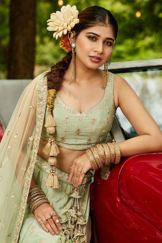 Regular price From £134.63 GBPRegular priceUnit price / per£146.83 GBPSale price From £134.63 GBP-8% OFFGreen Satin Wedding Reception Lehenga Choli SFFK28703