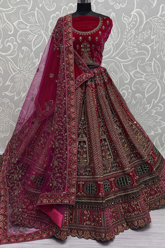 Pink Velvet Bridal Lehenga Choli Diamante Mirror work SFANJ3053