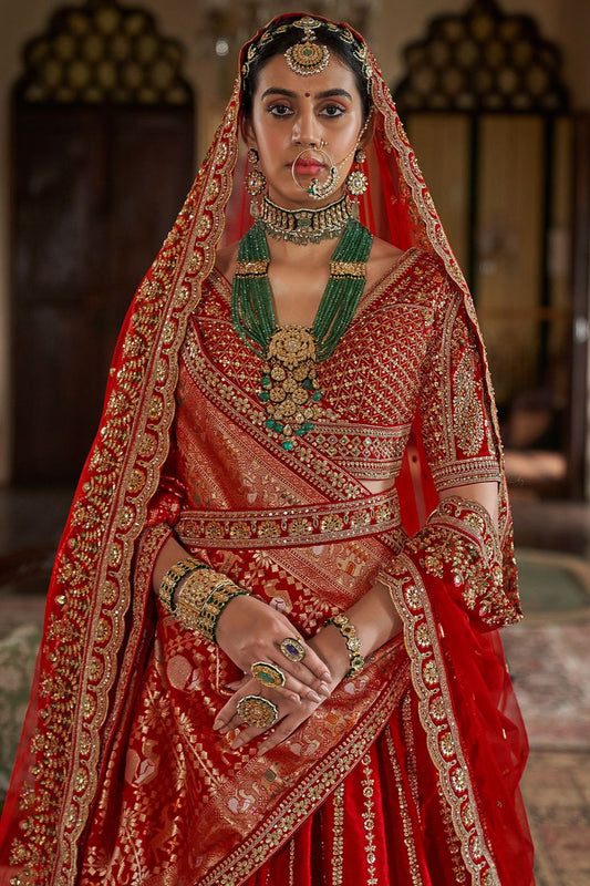 Regular price From £388.66 GBPRegular priceUnit price / per£458.09 GBPSale price From £388.66 GBP-15% OFFRed Silk Royal Bridal Lehenga Choli SFSJDN33906