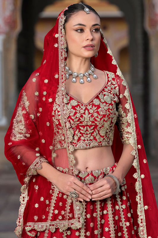 Regular price From £129.16 GBPRegular priceUnit price / per£167.09 GBPSale price From £129.16 GBP-22% OFFRed Gold Embroidered Net Bridal Lehenga Choli SFSA478904