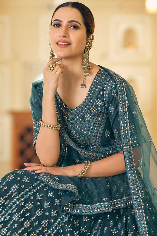 Regular price From £130.75 GBPRegular priceUnit price / per£175.75 GBPSale price From £130.75 GBP-25% OFFTurquoise Organza Partywear Lehenga Choli Foil Mirror Work SFARY8016