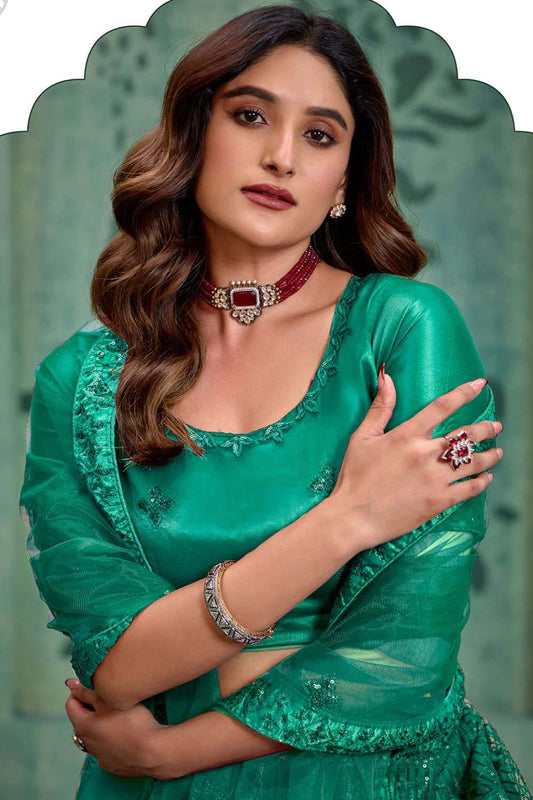 Green Sangeet Party Lehenga Choli Set In Chinnon SFSMT40705
