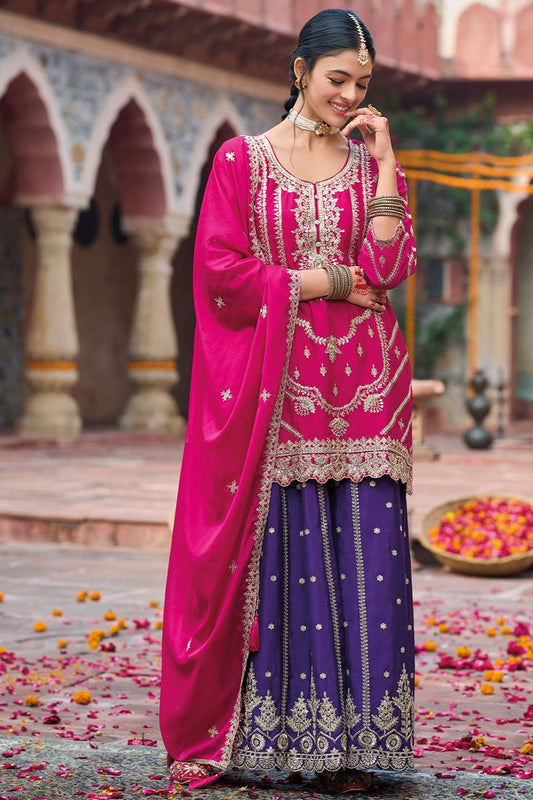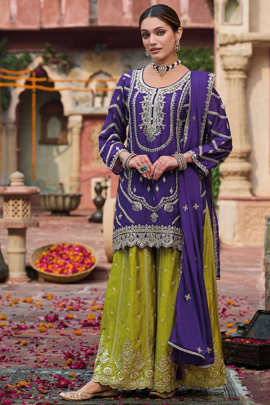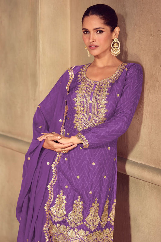 Regular price £101.46 GBPRegular priceUnit price / per£116.46 GBPSale price £101.46 GBP-12% OFFPurple Readymade Wedding Sangeet Palazzo Suit In Chinnon SFFK23802R