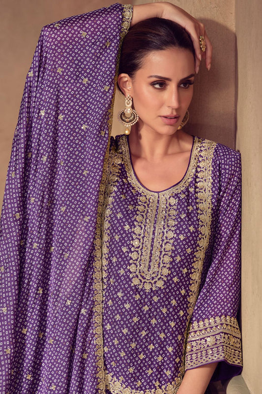 Regular price £119.35 GBPRegular priceUnit price / per£129.35 GBPSale price £119.35 GBP-7% OFFPurple Chinnon Palazzo Suit In Bandhani Print SFYS156401R