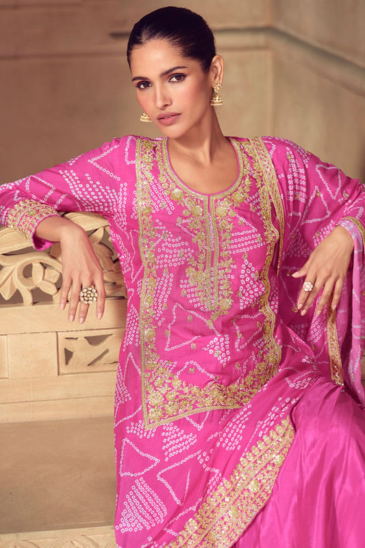 Regular price £117.35 GBPRegular priceUnit price / per£127.35 GBPSale price £117.35 GBP-7% OFFRani Pink Chinnon Palazzo Suit In Bandhani Print SFYS156402R