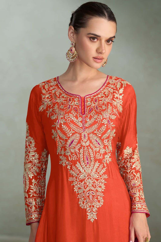 Regular price £152.96 GBPRegular priceUnit price / per£166.14 GBPSale price £152.96 GBP-7% OFFOrange Chinnon Silk Palazzo Suit Salwar Kameez SFSMT50604R