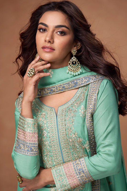 Regular price £104.47 GBPRegular priceUnit price / per£119.47 GBPSale price £104.47 GBP-12% OFFTurquoise Shimmer Silk Wedding Palazzo Suit With Sequin Work SFYS145502R