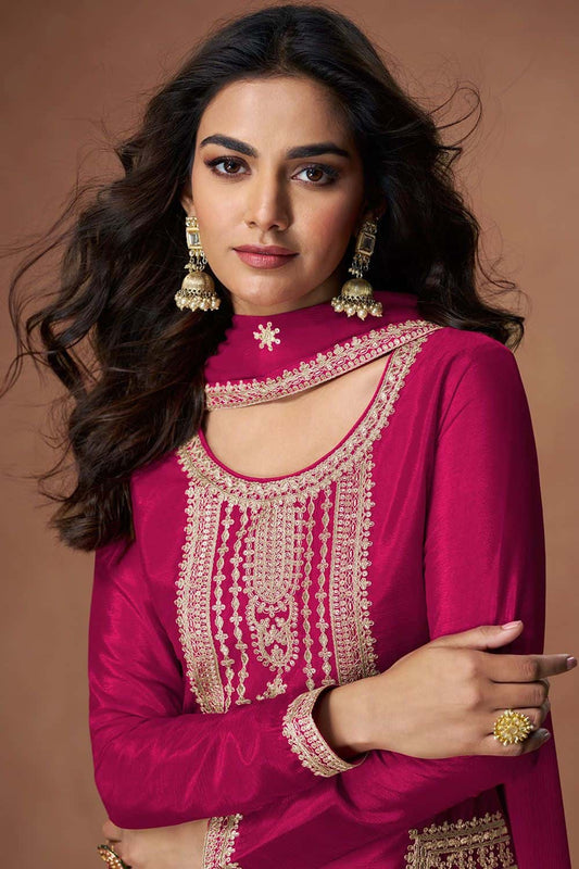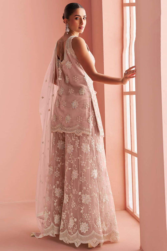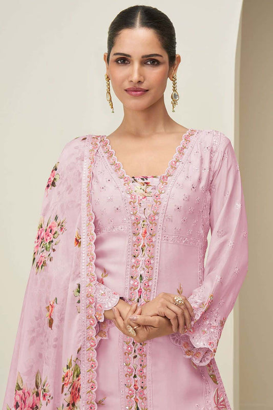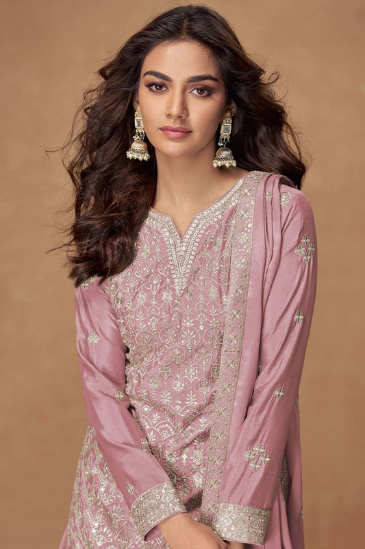 Regular price £117.34 GBPRegular priceUnit price / per£136.84 GBPSale price £117.34 GBP-14% OFFPink Minimalist Chinnon Palazzo Suit With Zari Embroidery Work SFYS156101R