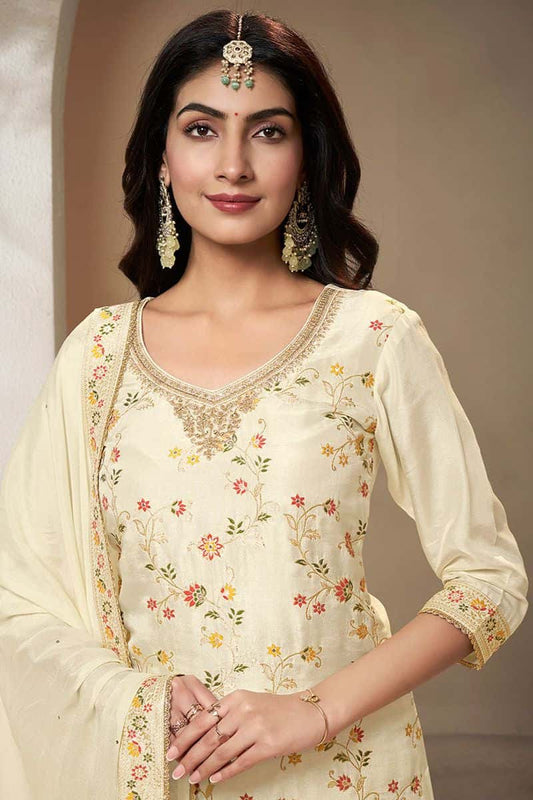Regular price From £204.20 GBPRegular priceUnit price / per£253.70 GBPSale price From £204.20 GBP-19% OFFCream Sharara Kameez Palazzo Suit Readymade In Silk SFVNF1704R