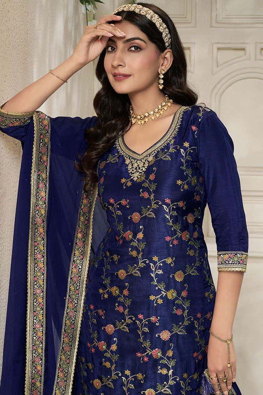 Regular price £143.98 GBPRegular priceUnit price / per£171.81 GBPSale price £143.98 GBP-16% OFFLuxe Blue Sangeet Palazzo Kameez In Chinnon Silk SFYS144601