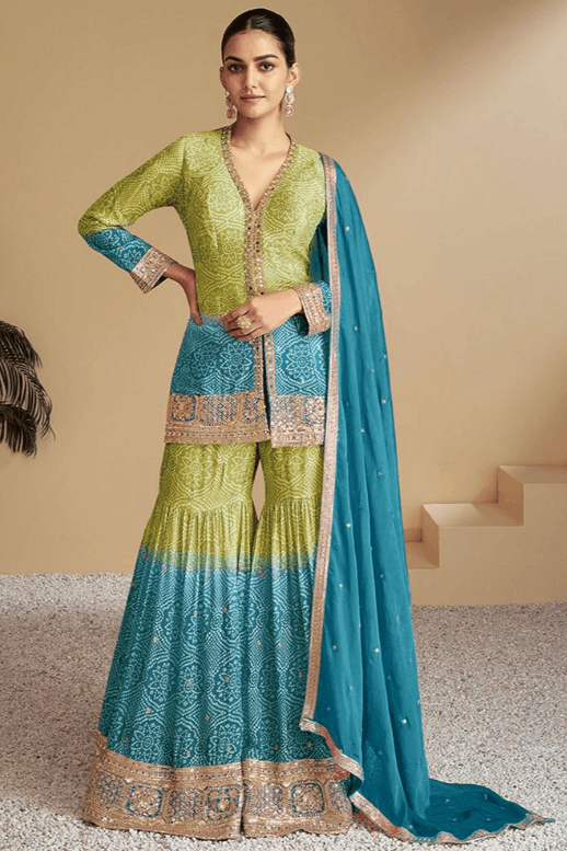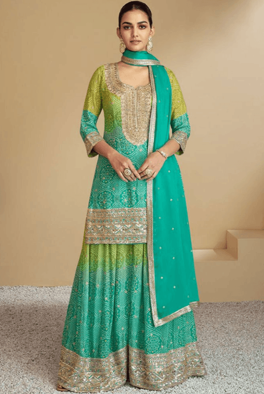 Regular price £143.98 GBPRegular priceUnit price / per£181.35 GBPSale price £143.98 GBP-20% OFFGreen Sangeet Chinnon Sharara Palazzo Suit SFABC4711R