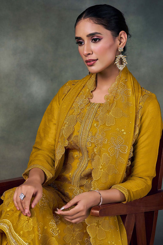 Regular price £115.15 GBPRegular priceUnit price / per£125.79 GBPSale price £115.15 GBP-8% OFFYellow Evening Chinnon Salwar Kameez Palazzo Suit SFYS154303R