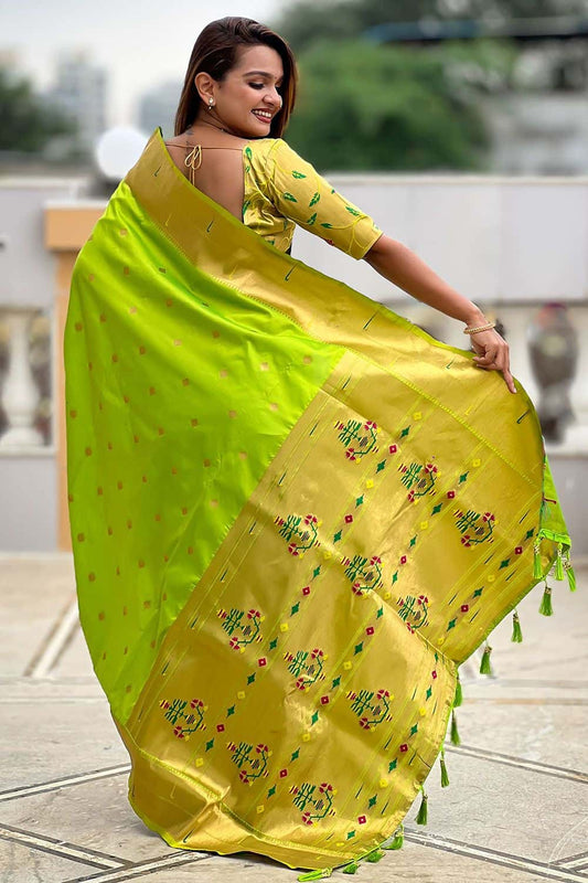 Regular price £147.63 GBPRegular priceUnit price / per£273.59 GBPSale price £147.63 GBP-46% OFFGreen Sleek Paithani Silk Saree With Blouse SFPRF251305