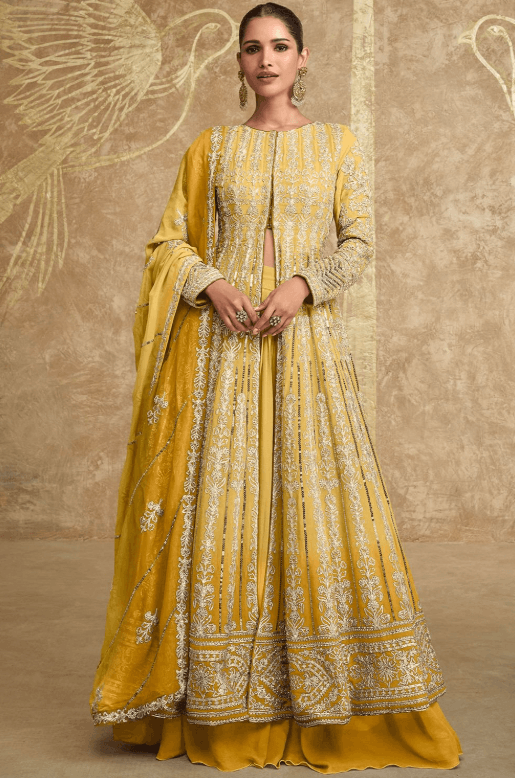 Regular price From £136.70 GBPRegular priceUnit price / per£201.70 GBPSale price From £136.70 GBP-32% OFFYellow Wedding Haldi Georgette Long Kameez Palazzo Suit SFYS154104R