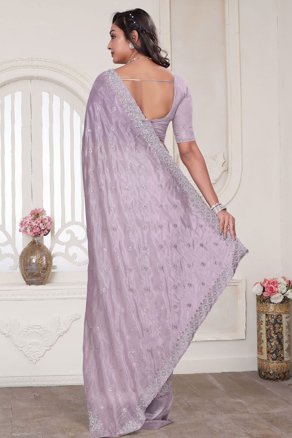 This silk saree is designed to make you shine at your wedding reception. Crafted from crystal silk, it features heavy sequins and zircon diamond embellishments that add dazzling sparkle and elegance.