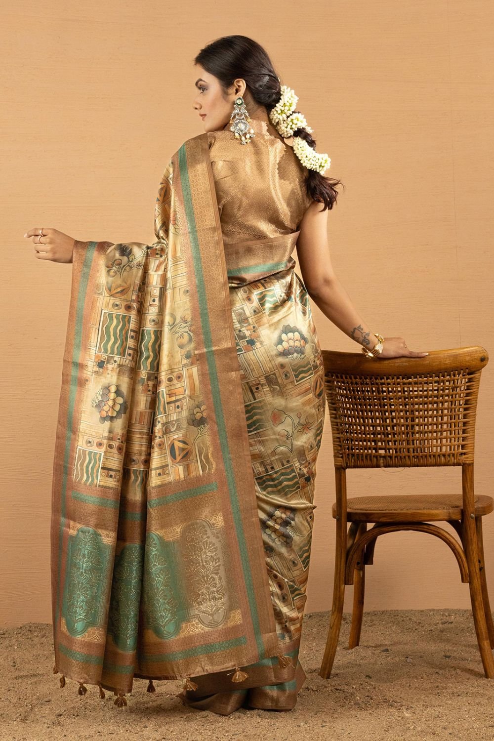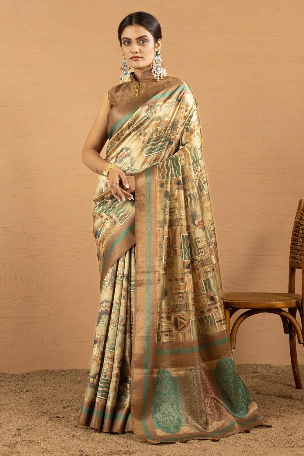Make a striking statement with this Jacquard Silk Saree, featuring intricate digital printed work that adds a modern twist to classic elegance.